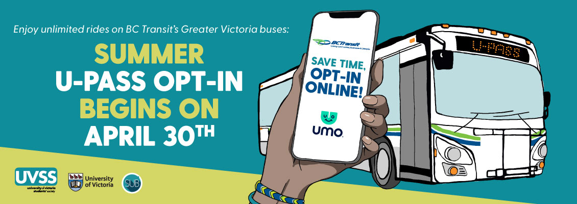 Locations on campus: UVSS info booth (SUB); Room 102 in Halpern Graduate Centre for Graduate Students; Continuing Studies Building second floor - Visit MyBusPass (in online tools) to get your unique-to-you UVic benefit code